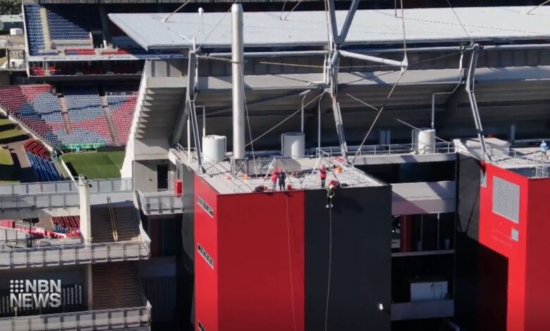 The group, abseiling down the front of McDonald Jones Stadium this morning, to raise funds for the Westpac Rescue Helicopter.