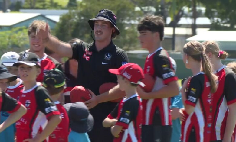 The 22-year-old trading Collingwood’s stadium lights to run drills with some enthusiastic juniors.
